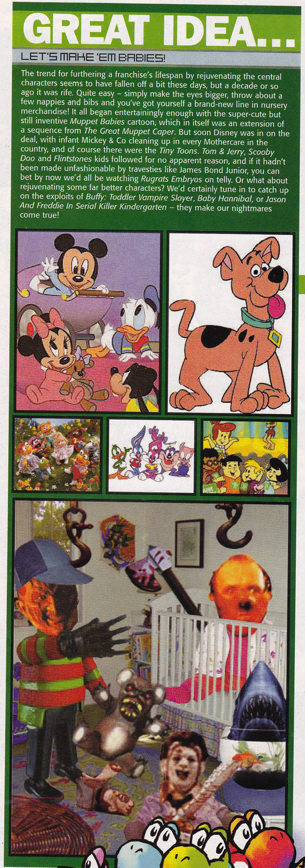 Secondly, from a year or two later, TA issue 34, a slightly more factual (i.e. less testicle-flavoured) item from the Yoshi’s Island review, concerning the act of infantilising famous characters, a la Baby Mario…