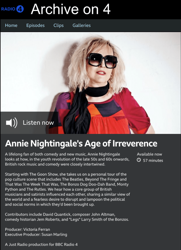 That would have been about the size of it, though. But then I had a call from Chris Daniels, the boss of the Bristol Slapstick festival – an annual mainstay which has emptied my pockets and left me shivering on Bristol street corners every January for about 15 years now. By sheer good fortune – given the horrendously muted roll-out the book has had, only recently given the slightest fillip by my appearance on the Radio 4 Archive Hour for Annie Nightingale’s ‘Age Of Irreverence’, exploring the links between rock and roll and comedy – Chris had read Fab Fools, and loved it, and felt excited that it presented a perfect chance to bring a bit of fab Beatledom to the festival…