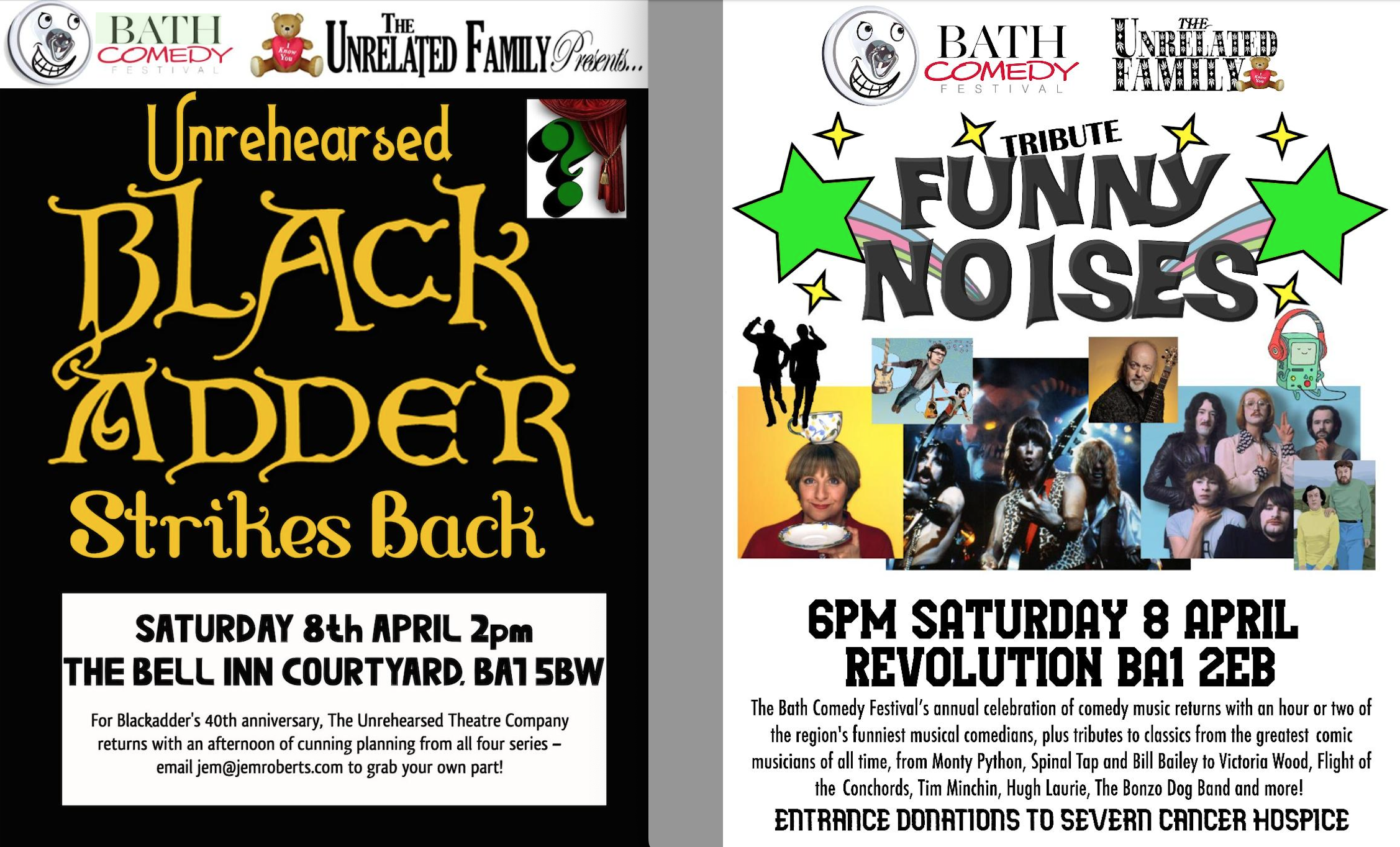 I had already booked in the first Tales of Britain live show in four years at this year’s Ludlow Fringe in June, just for the pleasure of sharing my stories in my hometown. The Bath Comedy Festival‘s regular duties are always calling me, of course, and this year our annual comedy music event FUNNY NOISES is in a lovely new venue – I just need to hear from some funny musicians to actually appear in the show! Plus, Blackadder’s 40th anniversary made an attempt to revive The Unrehearsed Theatre Company hard to resist, so we’ll be back at The Bell being noisy as well. Oh, and this year’s Bath Plug Award winner is ready to be announced… soon.