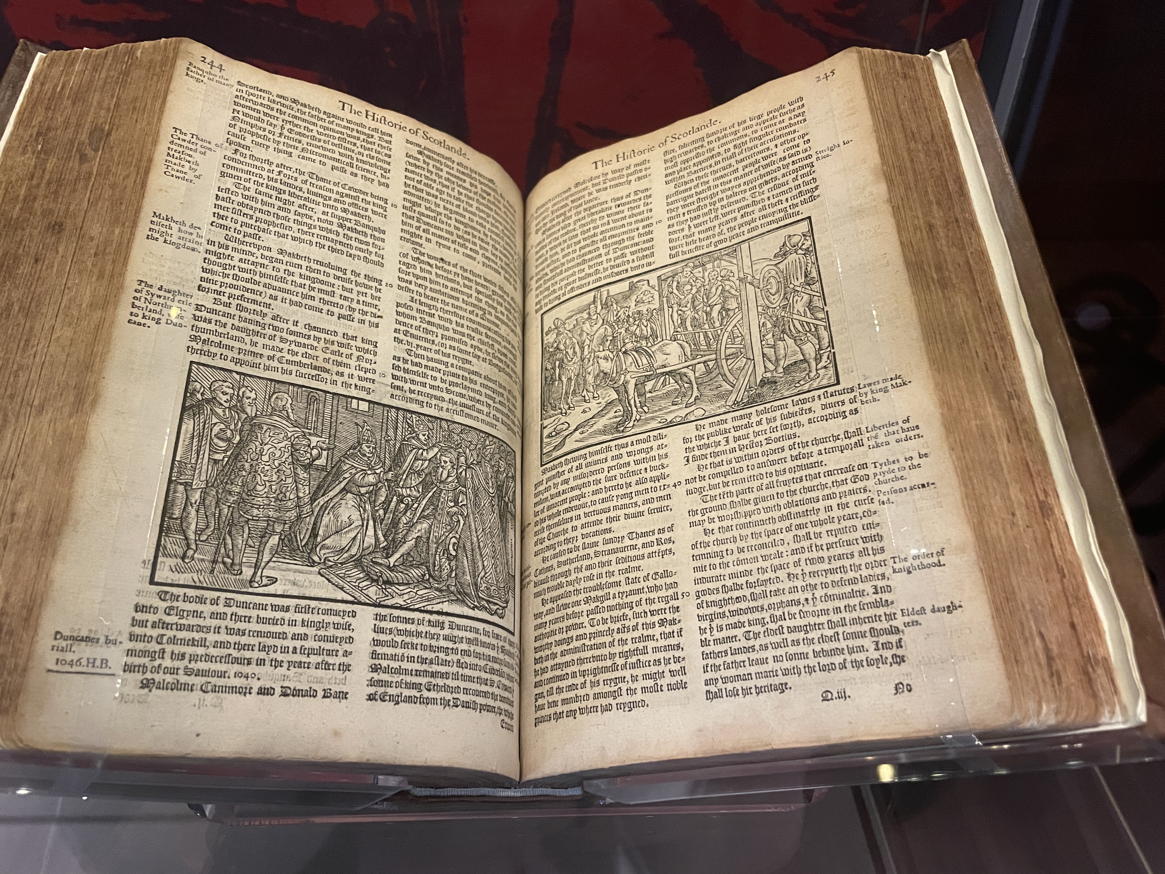 Our pilgrimage fittingly began with a special Macbeth exhibition at Perth Museum, which we only caught on its penultimate day. Of course, very nearly 1,000 years on, there’s really nothing tangible remaining from Macbeth’s day, so it was more of a theoretical exhibition, but it was awesome to behold a first edition of Holinshed’s Chronicles (which I hope to begin recording in instalments for Audible in the new year), and it was a wonderful primer for retracing the misunderstood ruler’s steps.