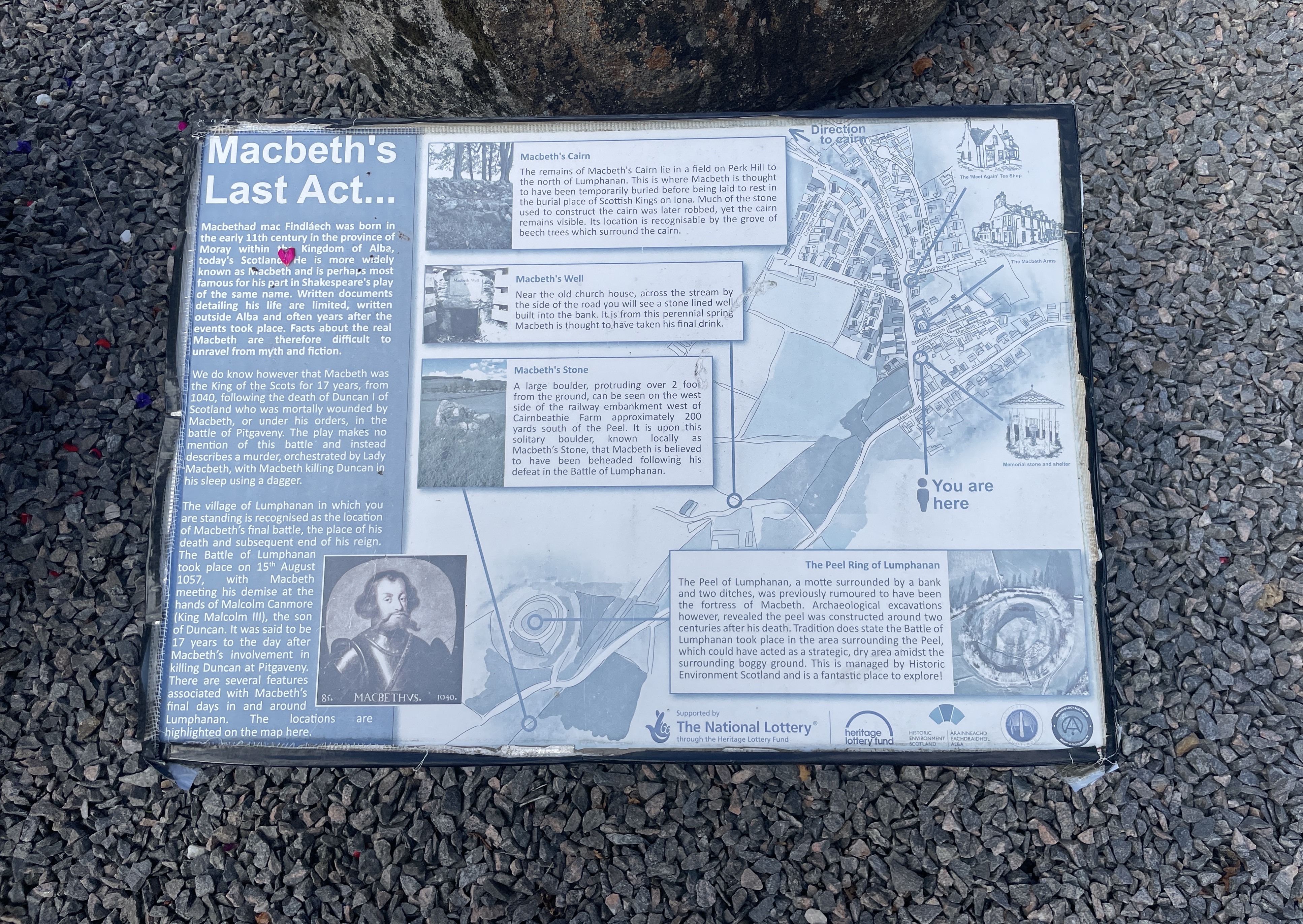 Otherwise, geographical necessity meant that visiting other locales from the real Macbeth’s story had to be in a higgledy-piggledy order. One of the first places we stopped was at Birnam Wood, which is a wee suburb that makes surprisingly little noise about its historical – or arguably legendary – connections, besides an info board pointing out the ‘Birnam Oak’, a tree which was centuries from budding in Macbeth’s time, but was a stripling in Shakespeare’s day. You don’t need me to tell you all about Birnam’s role in the story, and besides, we’ll soon be returning to that bit…