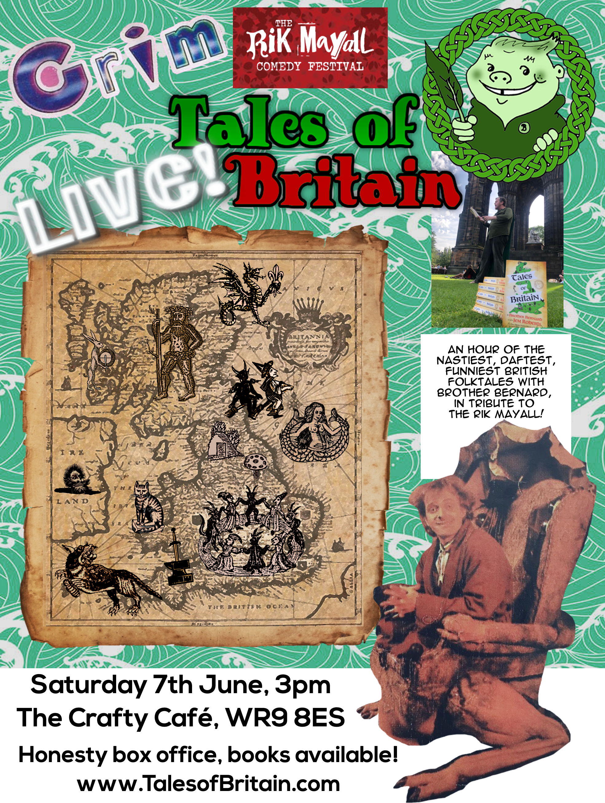 No matter what your age (though under-4s do best in a parent’s lap), folk of all possible ages can enjoy these tales, perhaps even requesting your own tale by picking a spot on the British map of folk tales! You can expect dragons, pigs, talking cats, booming ogres, thrilling battles, and even an enormous pie baked with FREE SWEETIES! Most shows are performed live by comedian/ Blackadder chronicler and ‘Tales of Britain’ author Jem Roberts, but sometimes he has the honour of being joined by beloved voice actor Kate Harbour (Shaun the Sheep, Bob the Builder, Octonauts) as BROTHER BERNARD & SISTER SAL!