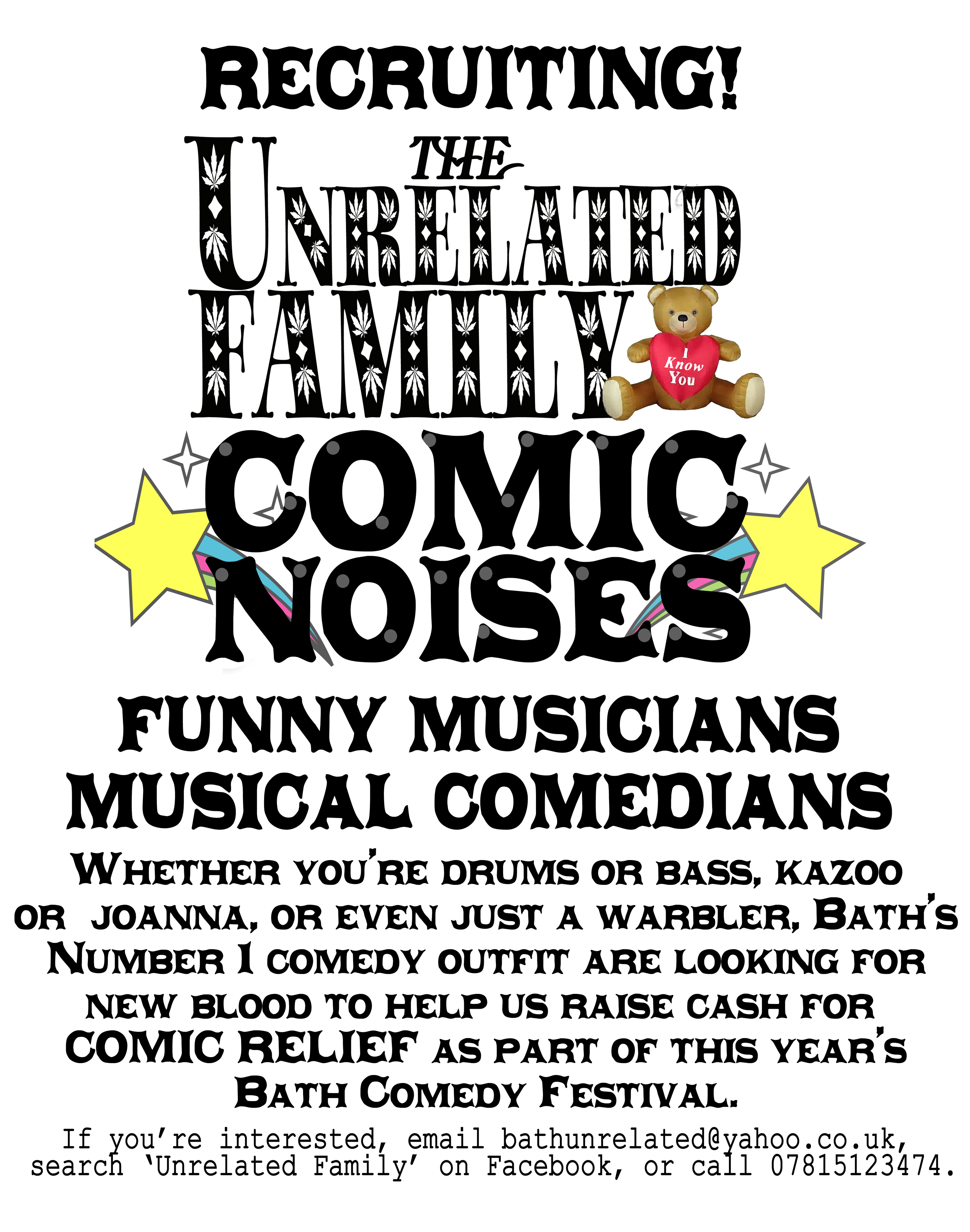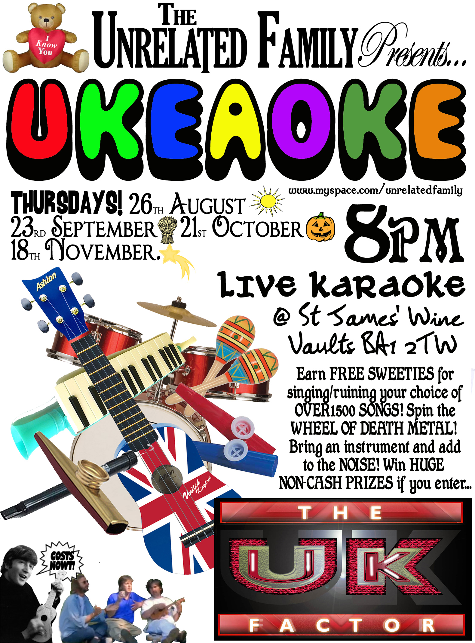 The Unrelated Family are Bath’s premier comedy sketch troupe-cum-Ukulele pop combo, set up in The Comedy Pub just off Leicester Square in 2007, and they still trundle along merrily enough now in many differing forms – comedy shows, improv, music shows, Unrehearsed Theatre (including MACBETH, DRACULA, BACK TO THE FUTURE and SOME MORE) and of course, many many instances of UKEAOKE! Ideal for parties where lots of low-quality noise is required.